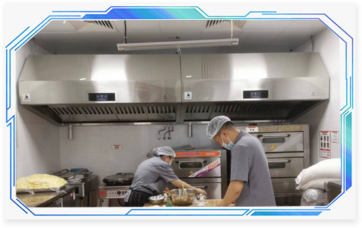 北京西平莊百姓大食堂為了支持響應國家“藍天保衛(wèi)戰(zhàn)”政策,整個大食堂都采用的這種壹指藍環(huán)保油煙機設備,不僅不用向外部排放油煙,還給廚房人員更好的工作環(huán)境,更健康的身體。